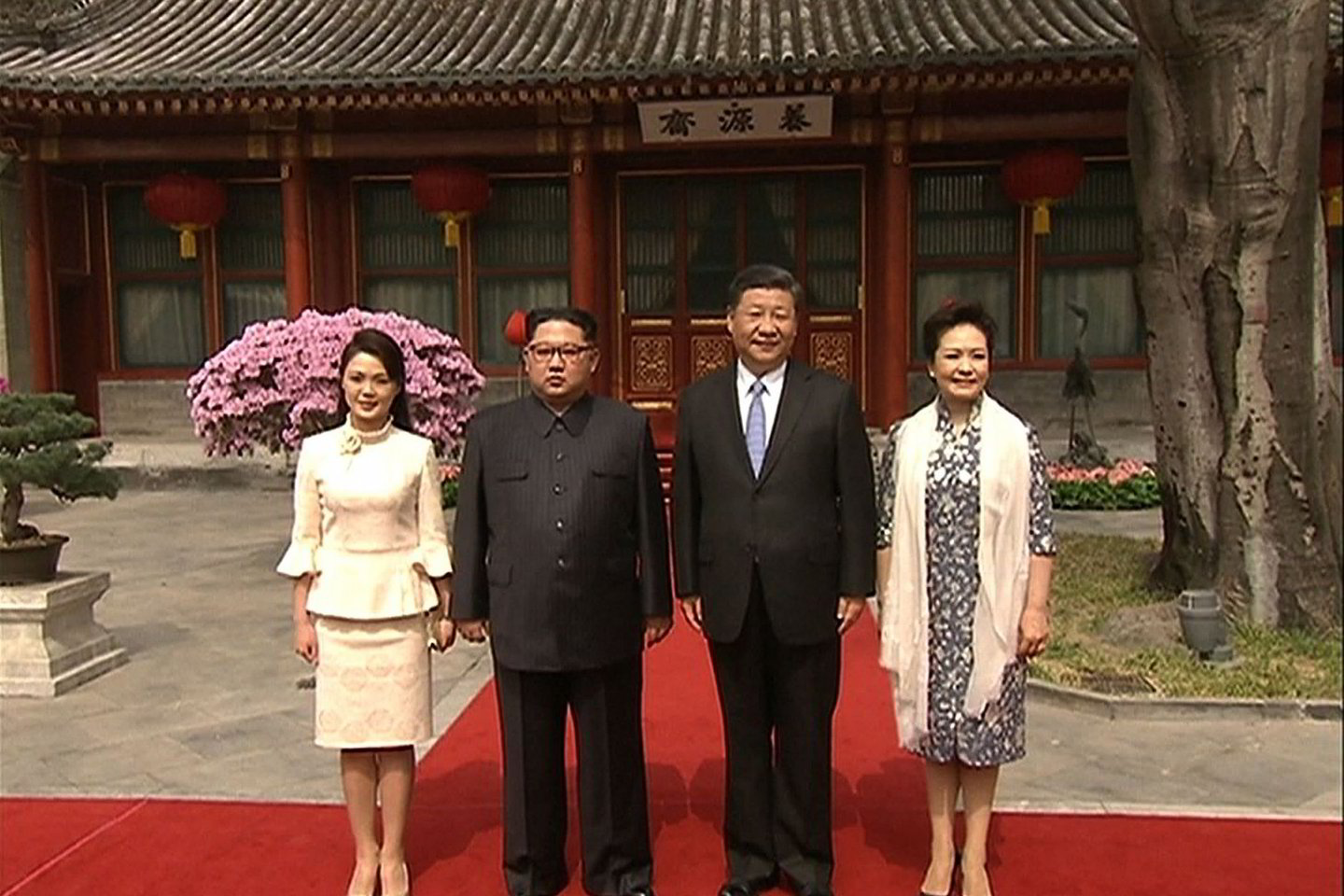 Kiek vėliau Xi Jinpingas ir jo sutuoktinė Peng Liyuan atsisveikino su besišypsančiais Kim Jong-unu ir jo žmona Ri Sol-ju, kurie išvyko juodu automobiliu.
