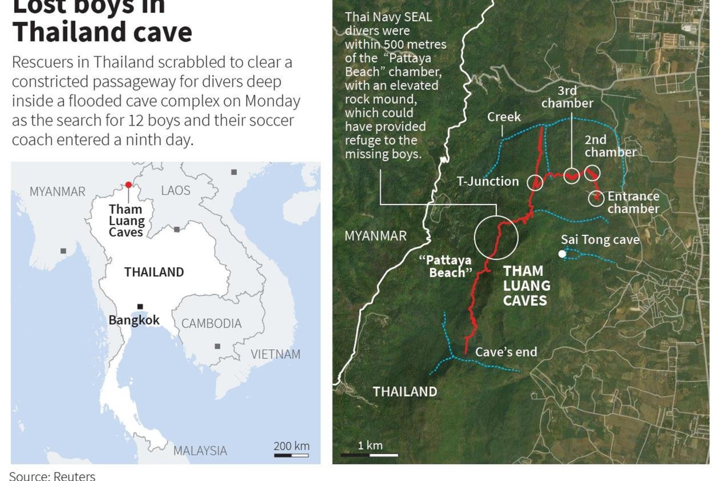 Vaikų paieškos prikaustė šalies ir pasaulio dėmesį. Užsienio ekspertų komandos iš Australijos, Anglijos, Japonijos ir Kinijos, taip pat daugiau kaip 30 JAV kariškių, atvyko į atokų kalnų rajoną padėti maždaug tūkstančiui Tailando gelbėtojų.