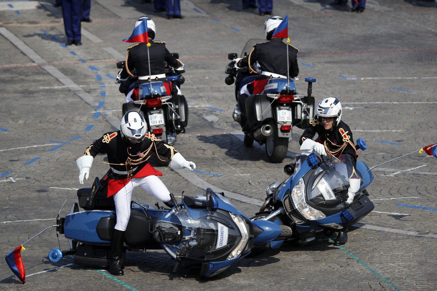 Motociklininkai priklausė grupei, atlikusiai sudėtingus manevrus Santarvės aikštėje Paryžiaus centre per kruopščiai surežisuotą pasirodymą. Susidūrę policininkai parkrito ant grindinio, bet greitai pakėlė savo motociklus ir sulaukė E. Macrono bei kitų žiūrovų plojimų.
