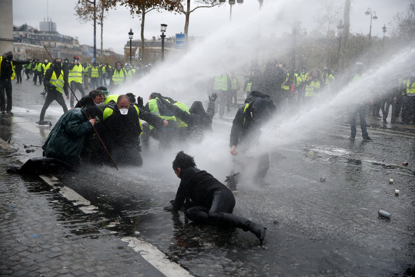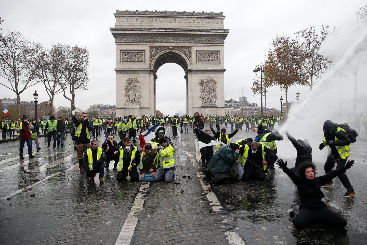 Susirėmimai tarp policijos ir demonstrantų, vilkėjusių šviesą atspindinčias geltonas liemenes, simbolizuojančias nepasitenkinimą E. Macrono politika, įsiplieskė netrukus po to, kai minios žmonių susirinko prie garsiosios alėjos galinės dalies esančios Triumfo arkos.