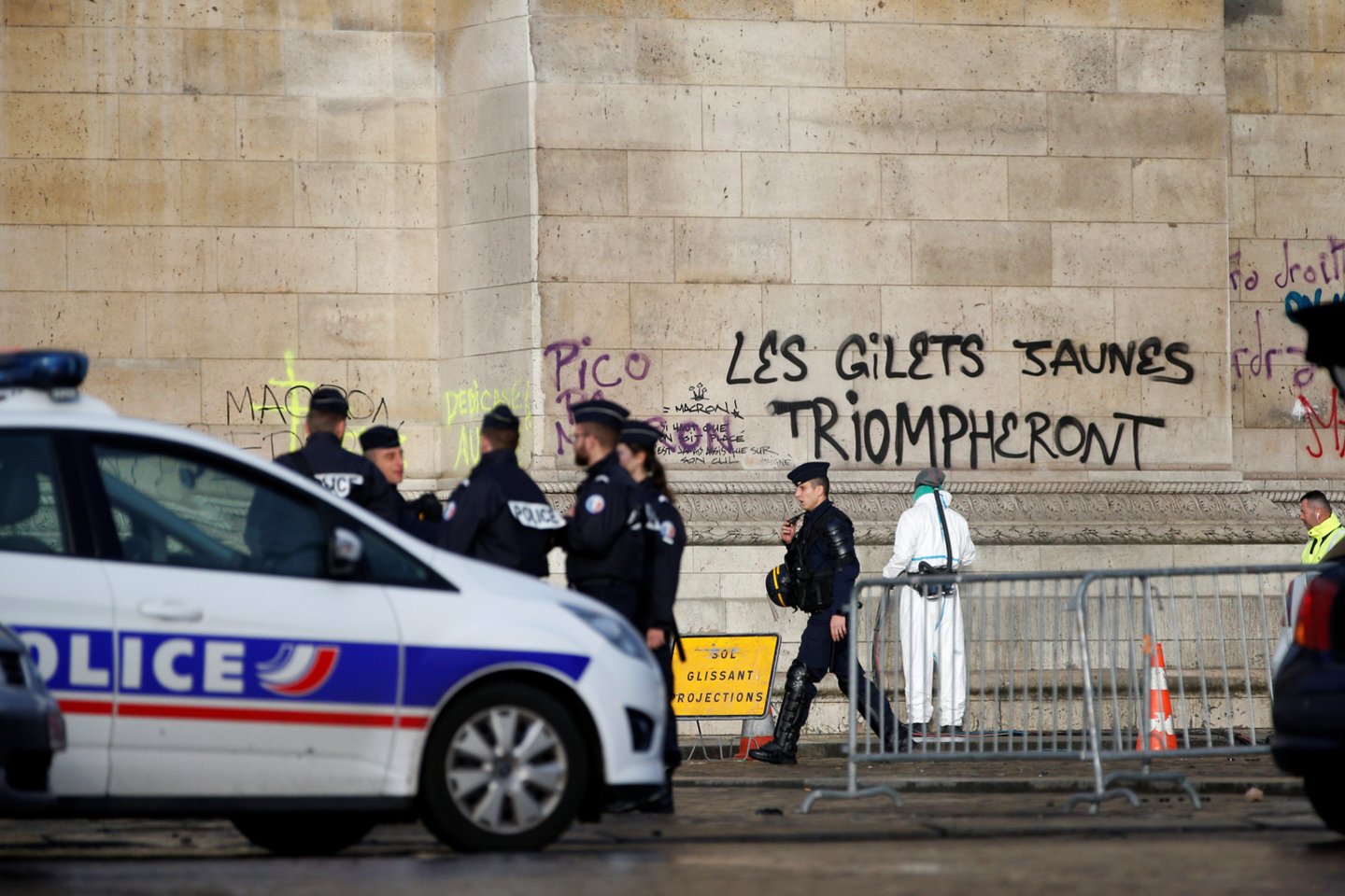 Per protestą prieš didėjančius mokesčius ir brangų pragyvenimą kilus riaušėms, aktyvistai su nepasitenkinimą prezidento Emmanuelio Macrono valdymu simbolizuojančiomis geltonomis liemenėmis padeginėjo automobilius, daužė langus, plėšė parduotuves ir grafičiais apipaišė Triumfo arką.