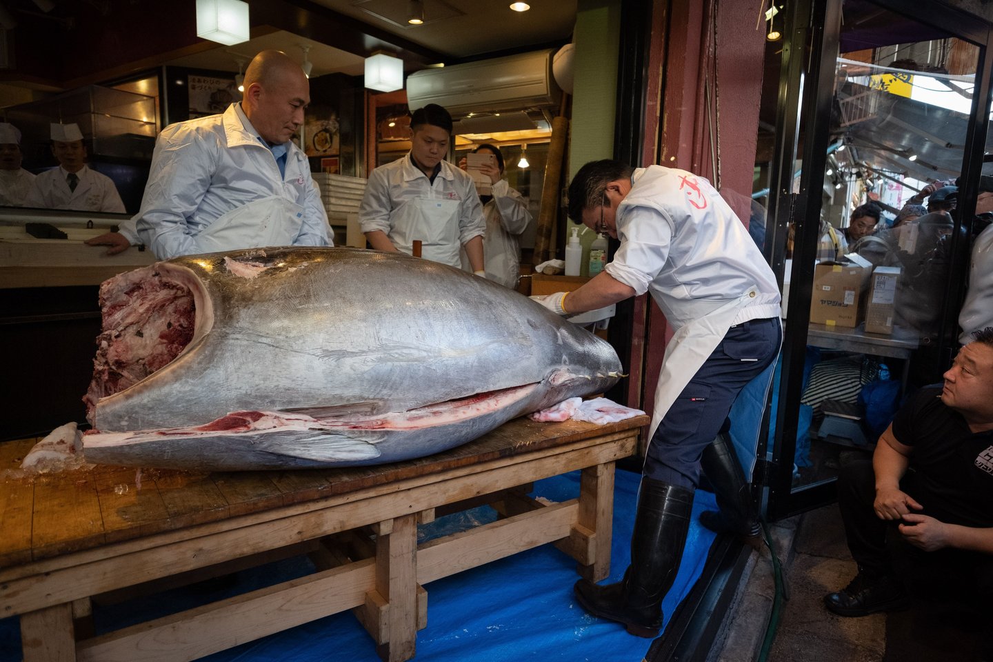 Vėliau šeštadienį sušių šefai japoniškus kalavijus primenančiais specialiais peiliais supjaustė didžiulę žuvį K. Kimuros pagrindiniame restorane, esančiame netoli Cukidžio turgaus, kur šiuo metu vykdomi griovimo darbai.