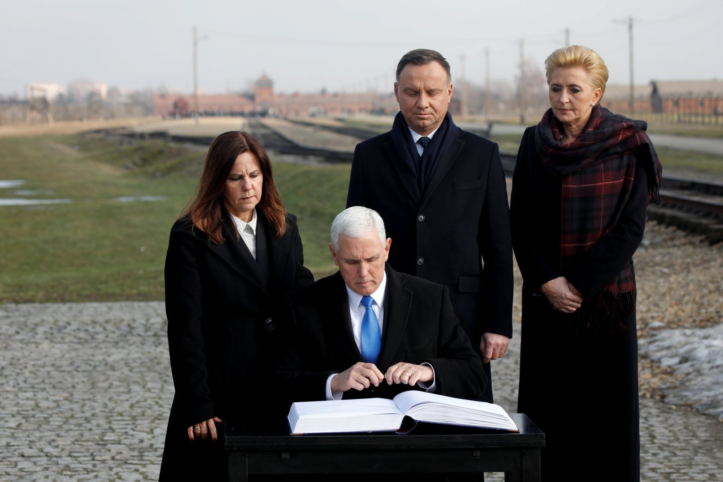 Kiek vėliau šalia esančiame Birkenau komplekse M.Pence'as apžiūrėjo likučius geležinkelio, kuriuo į stovyklą iš visos Europos buvo vežami nacių belaisviai, ir priklaupęs padėjo rožę ant memorialinio traukinio vagono laiptelio.