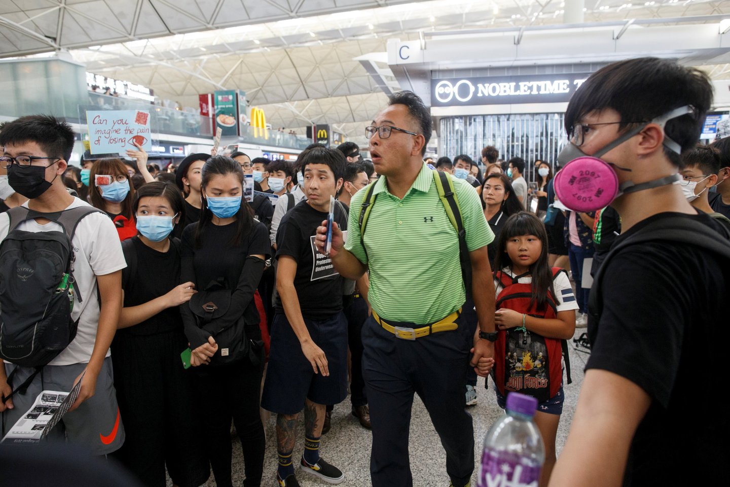 Oro uosto pranešime sakoma, kad demonstrantai „smarkiai sutrikdė“ jo veiklą ir pridūrė, kad visos keleivių registracijos į išvykstančius skrydžius buvo sustabdytos.