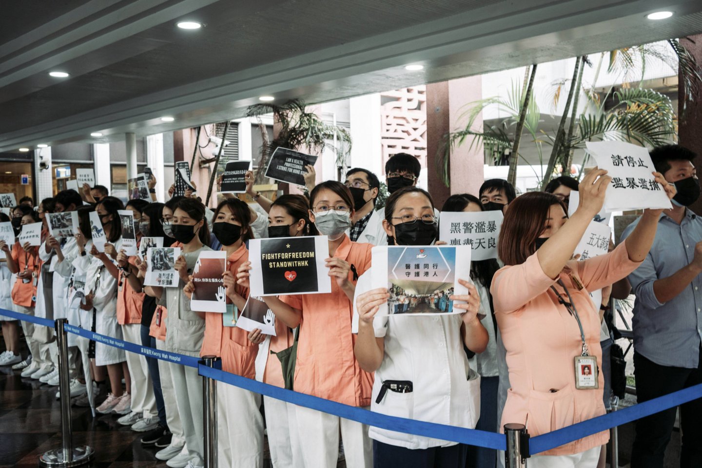 Uniformuotos Šv. Pranciškaus kanosiečių koledžo moksleivės suklaupė į eilę ir iškėlė ranka rašytus užrašus „Penki svarbūs reikalavimai: nė vienas nėra nebūtinas“. Šioje elitinėje mergaičių mokykloje mokėsi dabartinė Honkongo lyderė Carrie Lam.