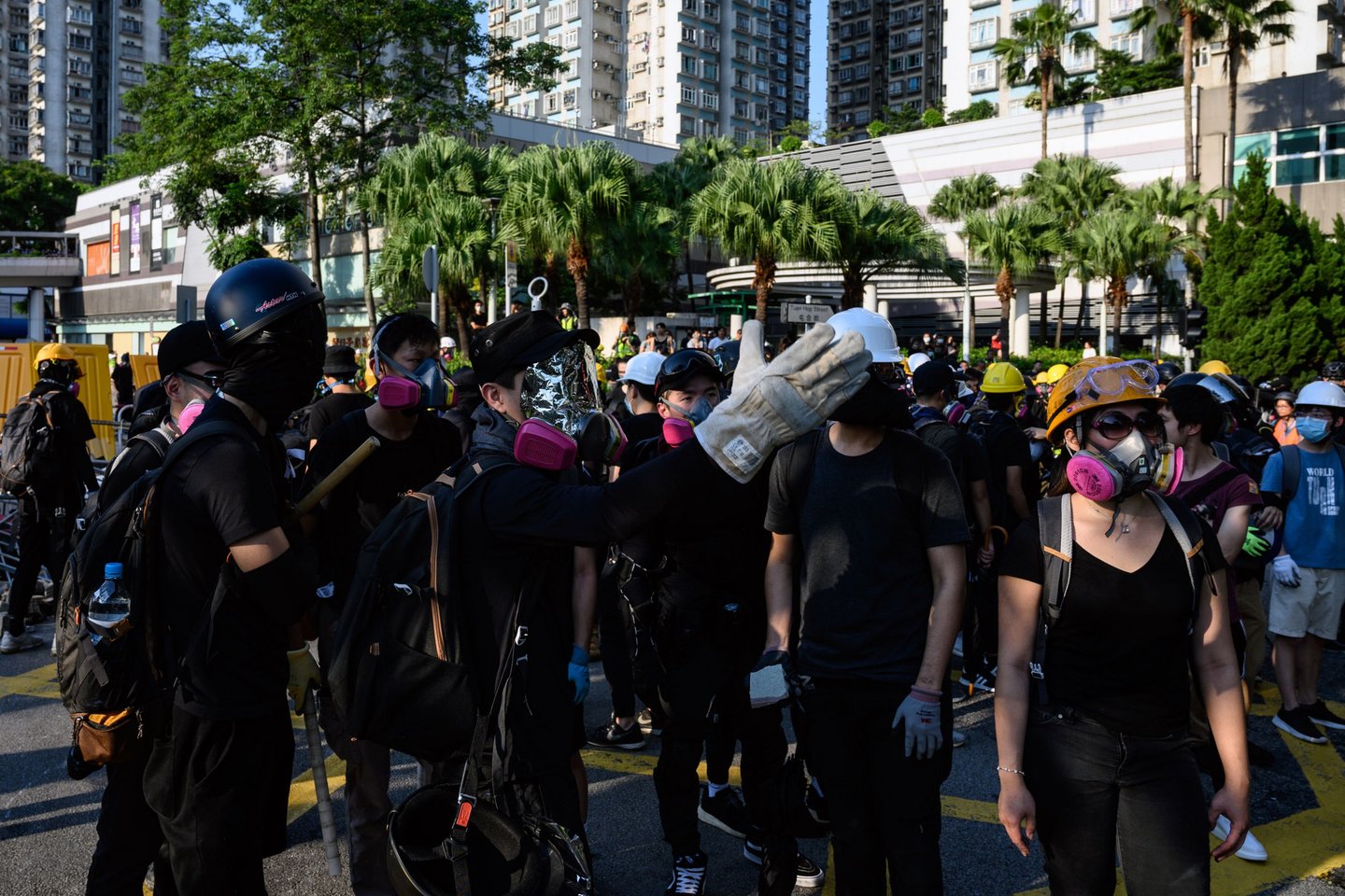 Šeštadienį protestuotojai, kurių dauguma buvo apsirengę juodai ir nešėsi skėčius – savo judėjimo simbolį – skandavo šūkius „Atgaukime Honkongą!“ ir „Mūsų laikų revoliucija!“