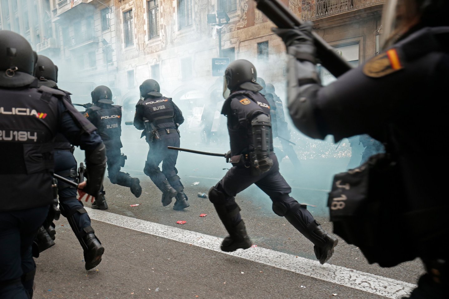 Dauguma protestuotojų atrodė taikūs, bet jaunuolių būriai ėmė siautėti prie policijos būstinės, kur sukėlė didžiulį gaisrą. Kiti gaisrai degė netoli Katalonijos aikštės.