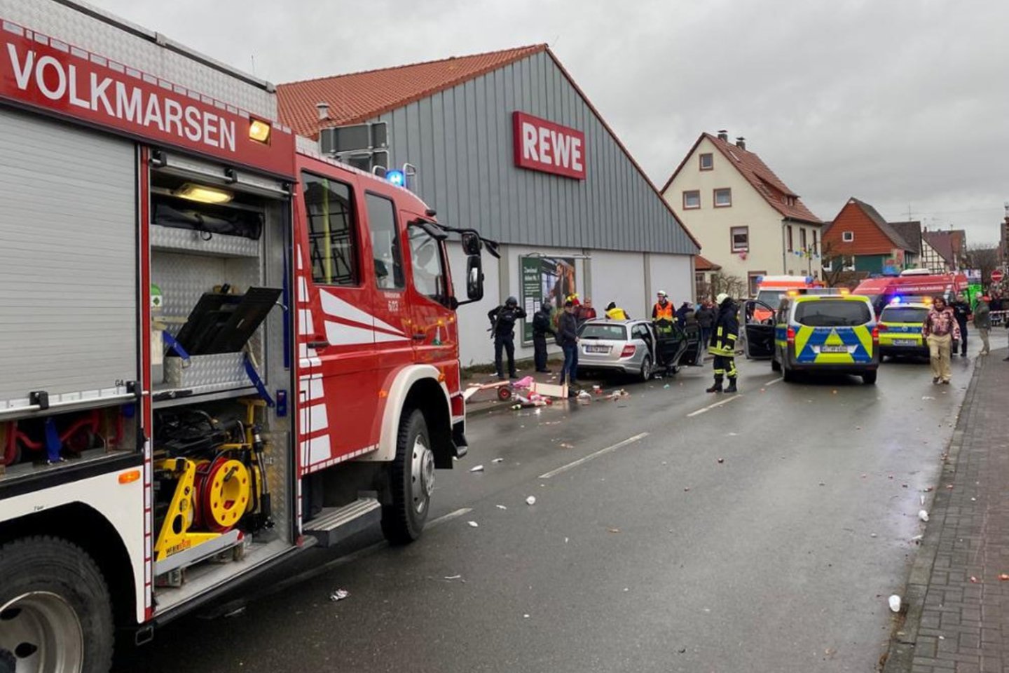 Antradienio rytą Folmarzene dar galima buvo išvysti karnavalo platformų ir balionų. Įvykio vietoje matėsi pagalbos automobilių ir išvežamas įtariamojo „Mercedes“ .