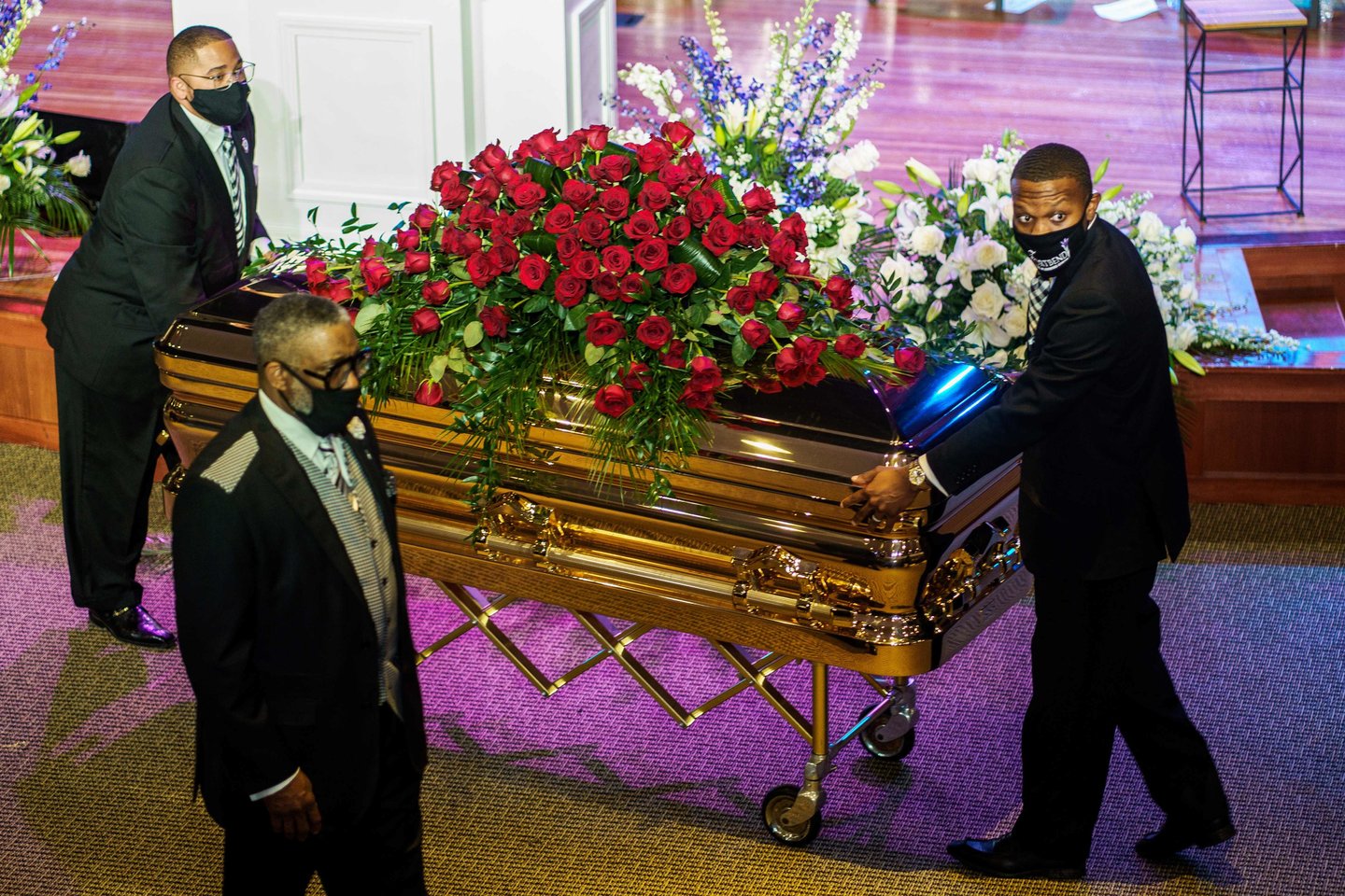 Mineapolio policijos viršininkas Medaria Arradondo priklaupė, kai katafalkas atvežė G. Floydo palaikus į pamaldas.