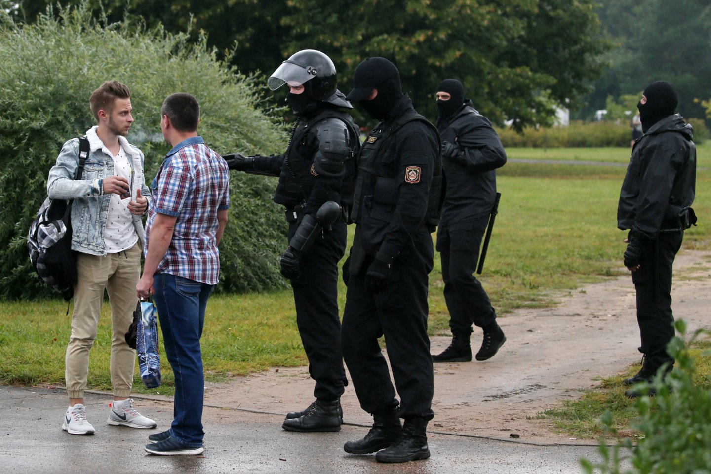 Tuo metu Baltarusijos vidaus reikalų ministerija pranešė, kad policija sulaikė tik du protestuotojus, o likusią minią nustūmė į šalį.