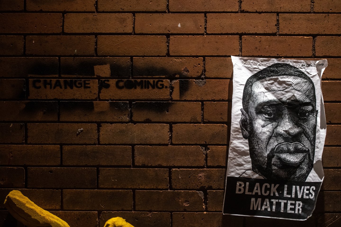 Ankstų penktadienį Mineapolio centre kelios dešimtys protestuotojų skandavo „George'as Floydas!“ bei nešė transparantus ir didelę vėliavą su užrašu „Juodaodžių gyvybės svarbios“.