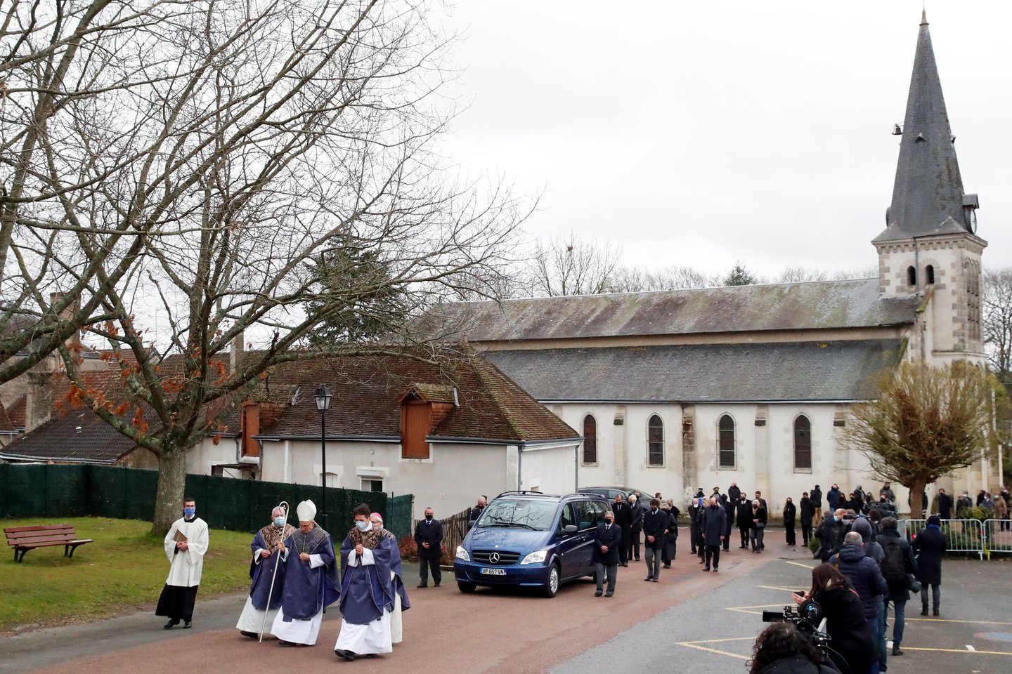 Per laidotuves, vykusias prižiūrint policijai, buvusio prezidento karstas, uždengtas Prancūzijos ir Europos Sąjungos vėliavomis, buvo įneštas į Šv. Hilarijaus bažnyčia Otone, sakė vienas AFP korespondentas.