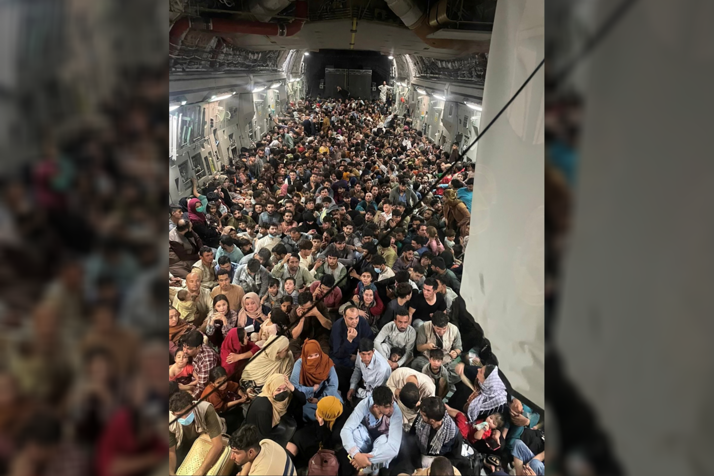 Daugybė afganų, kuriems buvo leista evakuotis, sugebėjo patekti į pusiau atvirą orlaivio rampą. Nepaisydama pavojingo keleivių skaičiaus, įgula nusprendė pakilti.