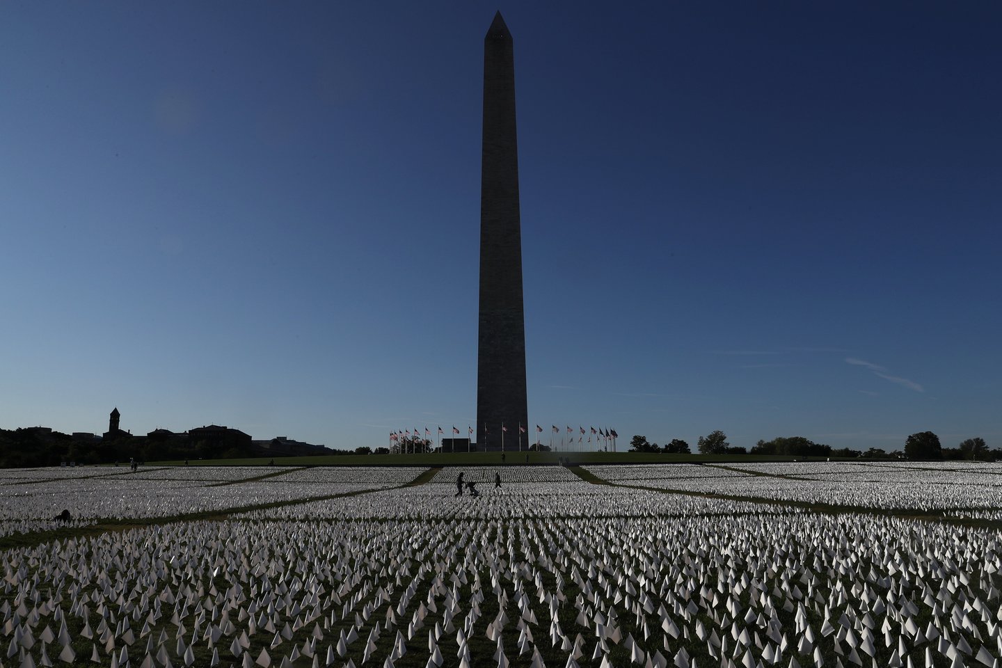 Vašingtone šimtai tūkstančių baltų vėliavėlių plazdėjo Nacionalinės alėjos pievelėje netoli Baltųjų rūmų, primindamos visas COVID-19 aukas Jungtinėse Valstijose.