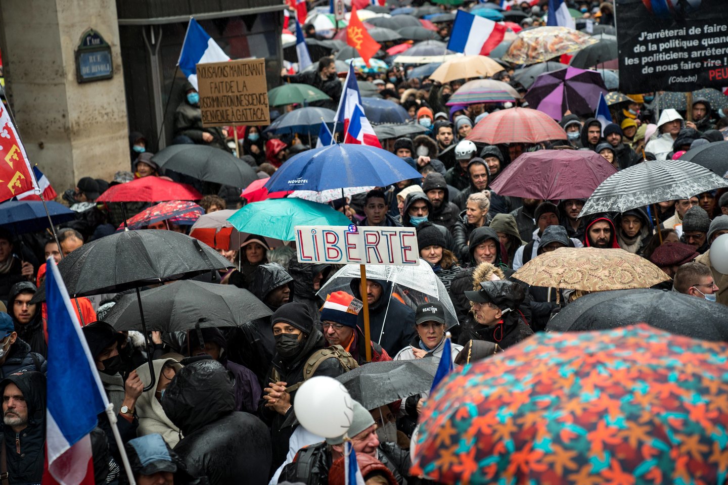 Paryžiuje protestuotojai – daugelis jų buvo be kaukių – nepabūgę šalto oro ir lietaus mosavo plakatais su užrašais „Tiesa“ ir „Skiepų pasams – ne“.