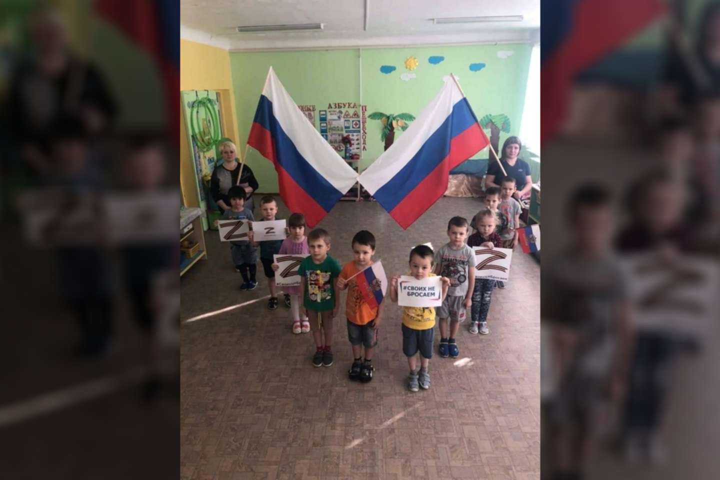 „Tokiu sudėtingu metu visos mūsų šalies gyventojams svarbiausia būti vieningais ir tvirtais žmonėmis, būti kartu, neapleisti savo tautiečių ir mūsų karių, kurie kiekvieną dieną demonstruoja didvyriškumą ir stiprybę, – rašė administracija socialiniame tinkle VK. – Vadovaujami auklėtojos N. G. Poltavcevos, mūsų darželinukai piešė paveikslėlius ir sukūrė laikraštį „Mes už Rusiją!“, taip pat papuošė savo klasės langus.“