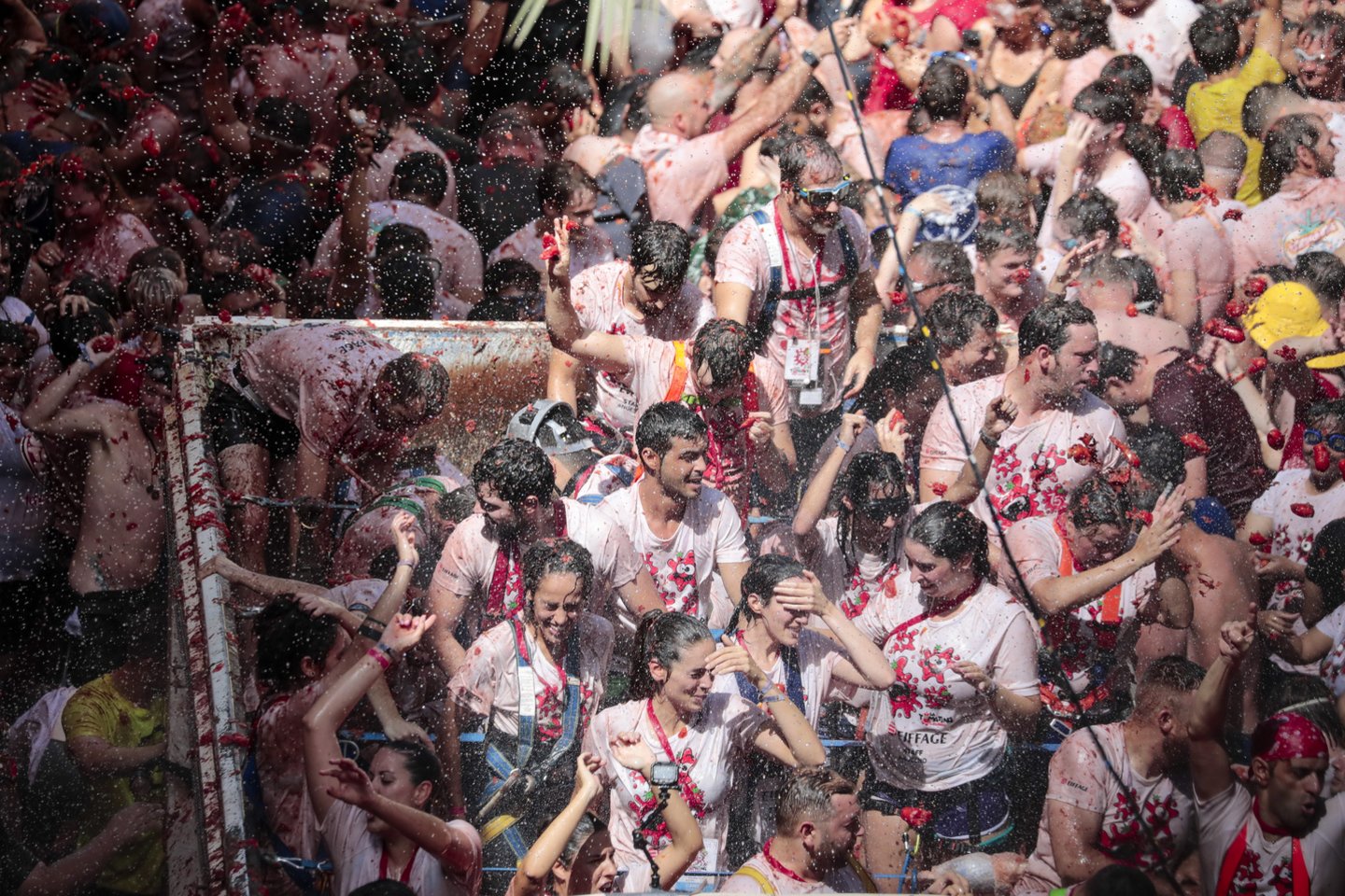 Praėjus kelioms minutėms po duoto starto miestelis ir tradiciškai balti „Tomatina“ dalyvių rūbai nusidažė raudonai. Daugelis jų buvo su akiniais nuo saulės, plaukimo akiniais ar nardymo kaukėmis, kad nuo pomidorų apsaugotų akis.