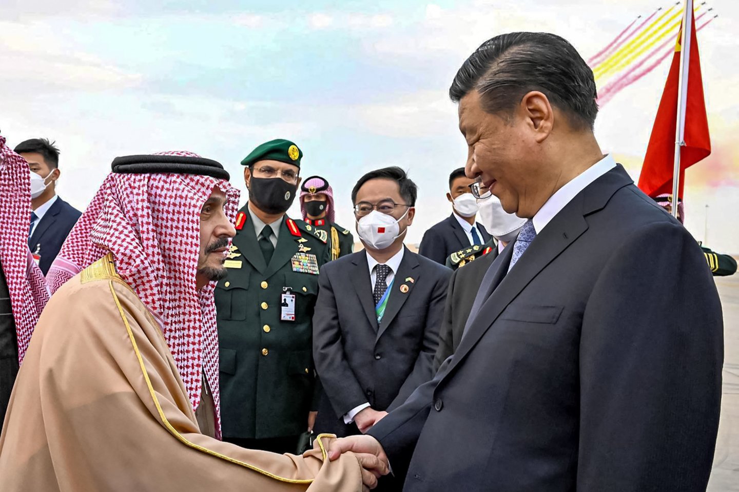 Trečiadienį atskridusį Xi Jinpingą Jamamos rūmuose, oficialioje karaliaus rezidencijoje, rankos paspaudimu pasitiko 37 metų sosto įpėdinis princas Mohammedas bin Salmanas, faktinis didžiausios pasaulyje naftos eksportuotojos valdovas.