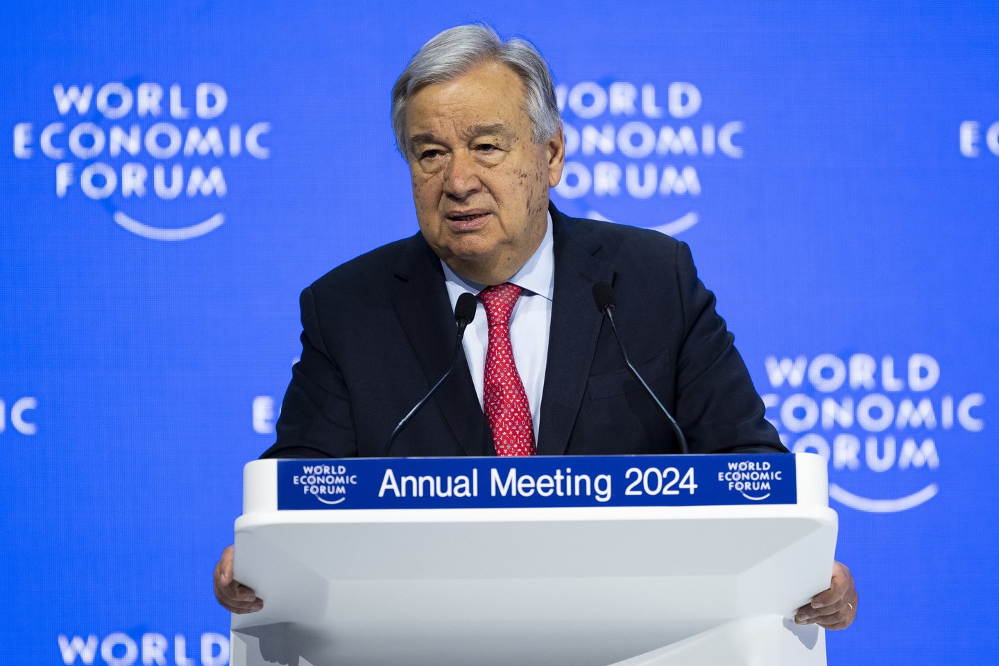 A. Guterresas Davose pakartojo savo reikalavimą dėl „neatidėliotinų humanitarinių paliaubų“ Gazos Ruože bei dviejų valstybių sambūviu pagrįsto sprendimo įgyvendinimo.