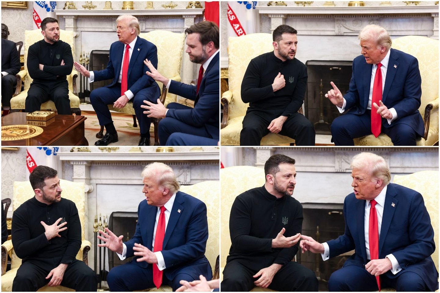 D. Trumpas priekaištavo V. Zelenskiui, kai jie sėdėjo Ovaliajame kabinete, sakydamas, kad jis turėtų būti „dėkingesnis“. „Jūs negalite diktuoti, ką mes jausime“, – tvirtino D. Trumpas, po tai, kai V. Zelenskis pasakė, jog Amerika dar nejaučia, ką reiškia Rusijos agresija, tačiau gali tai pajausti ateityje.