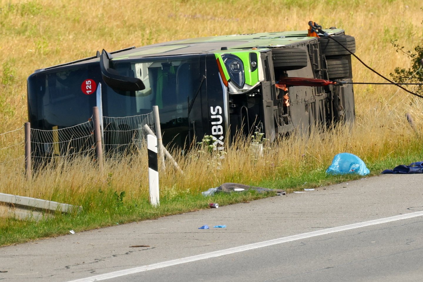 Bendrovės „FlixBus“ autobusas nuvažiavo nuo kelio į dešinę ir apvirto. Avarijos priežastis kol kas neaiški.