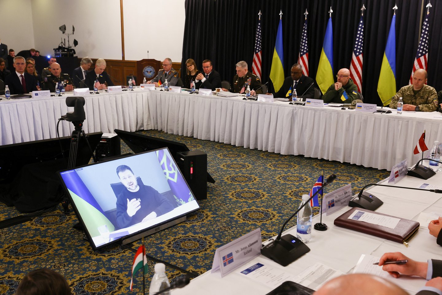 JAV gynybos sekretoriui baigus savo pranešimą, Ukrainos prezidentas Volodymyras Zelenskis nuotoliniu būdu kreipėsi į susirinkusiuosius, pakartodamas savo raginimą tiekti Ukrainai tankus ir kitą gynybai nuo agresorės Rusijos skirtą karinę techniką.
