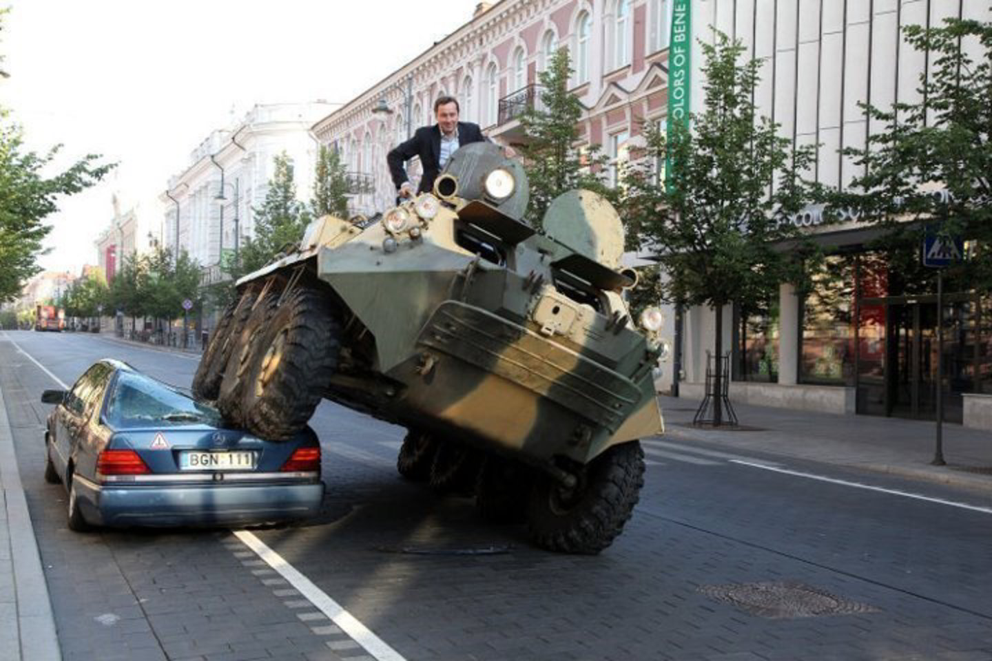 Po nuotraukomis yra tokie prierašai: „Man pabodo istorijos apie prabangius automobilius, kurie parkuojami ant dviračių takų ar pėsčiųjų perėjos“, „Tankas gera priemonė spręsti parkavimo ne vietoje problemas“.