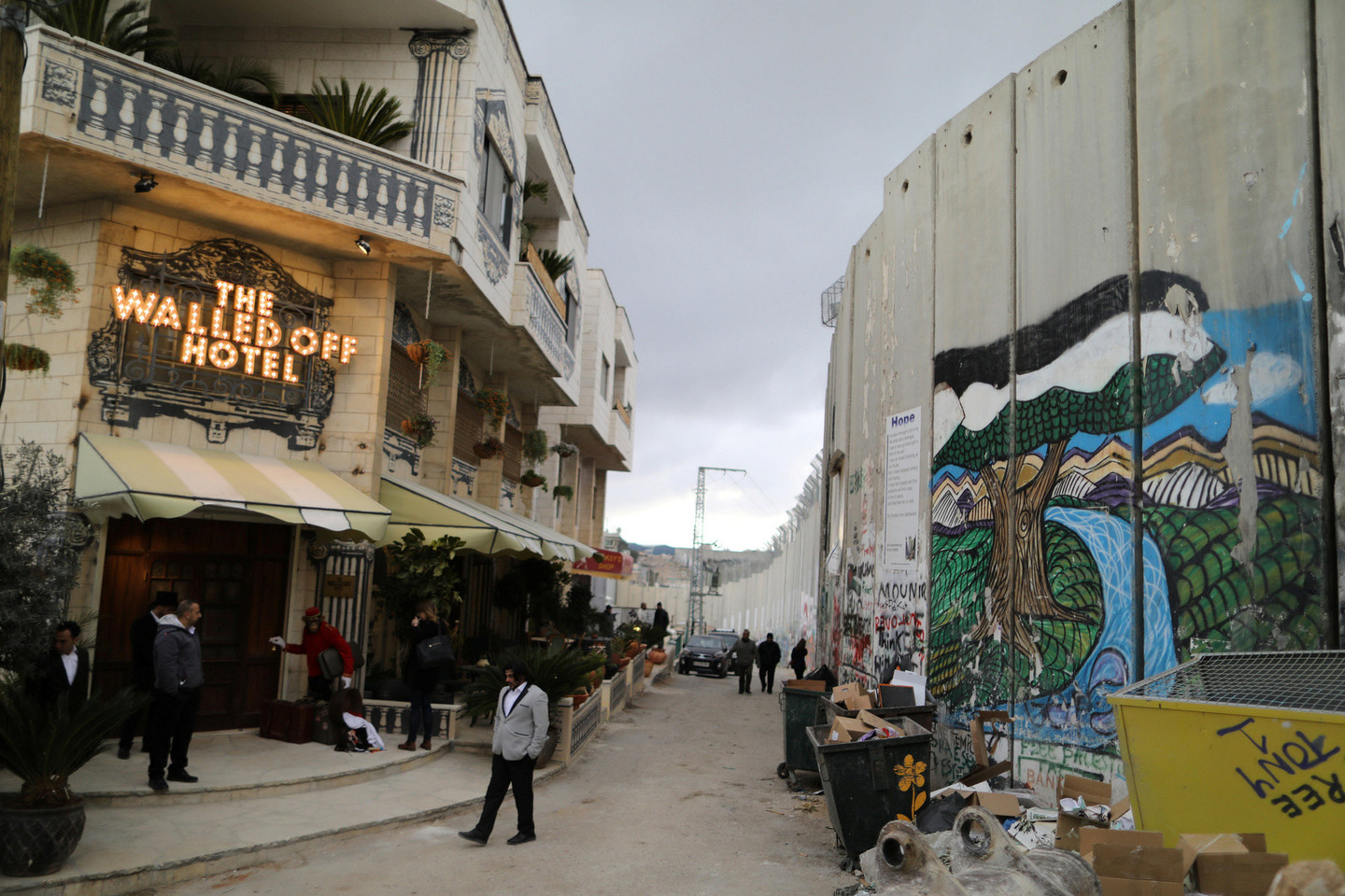 Dešimties kambarių viešbutis „Walled Off“ („Atitvertas siena“) gerai dera prie kitų distopinių menininko darbų – pro jo langus matoma okupuotą Vakarų Krantą dalinanti niūri siena.