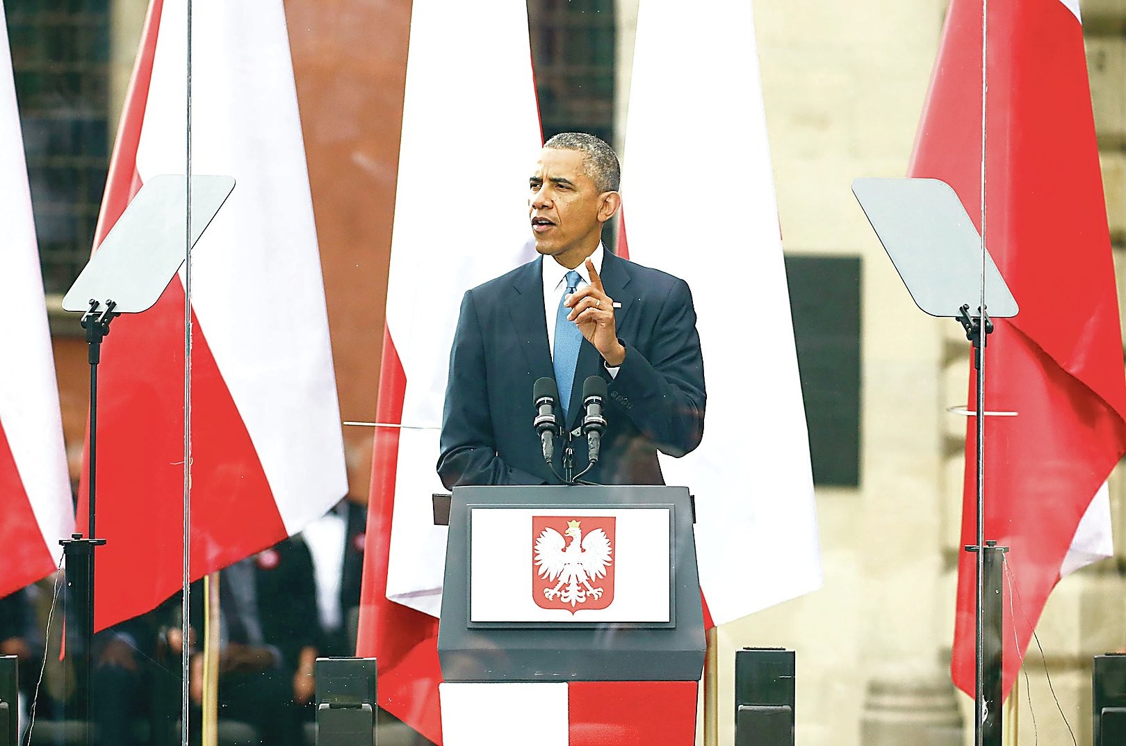 Garbūs svečiai, lenkai, dėkoju už jūsų nepaprastą priėmimą ir garbę švęsti kartu su jumis. Noriu jums perduoti amerikiečių tautos sveikinimus ir draugystės žodžius, taip pat iš mano gimtojo miesto Čikagos, kuriame gyvena tiek daug besididžiuojančių savo lenkiška kilme amerikiečių.