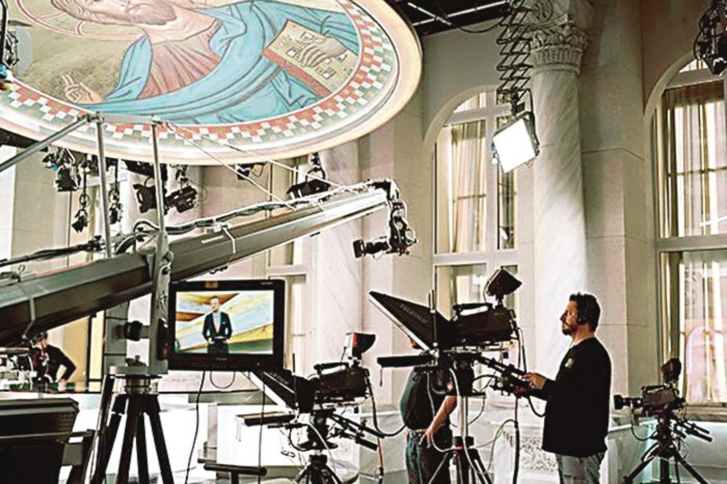 „Cargrad TV“ studijoje, kurią puošia pusės tonos svorio cerkvės lubų imitacija, K.Malofejevas jaučiasi kaip namie.