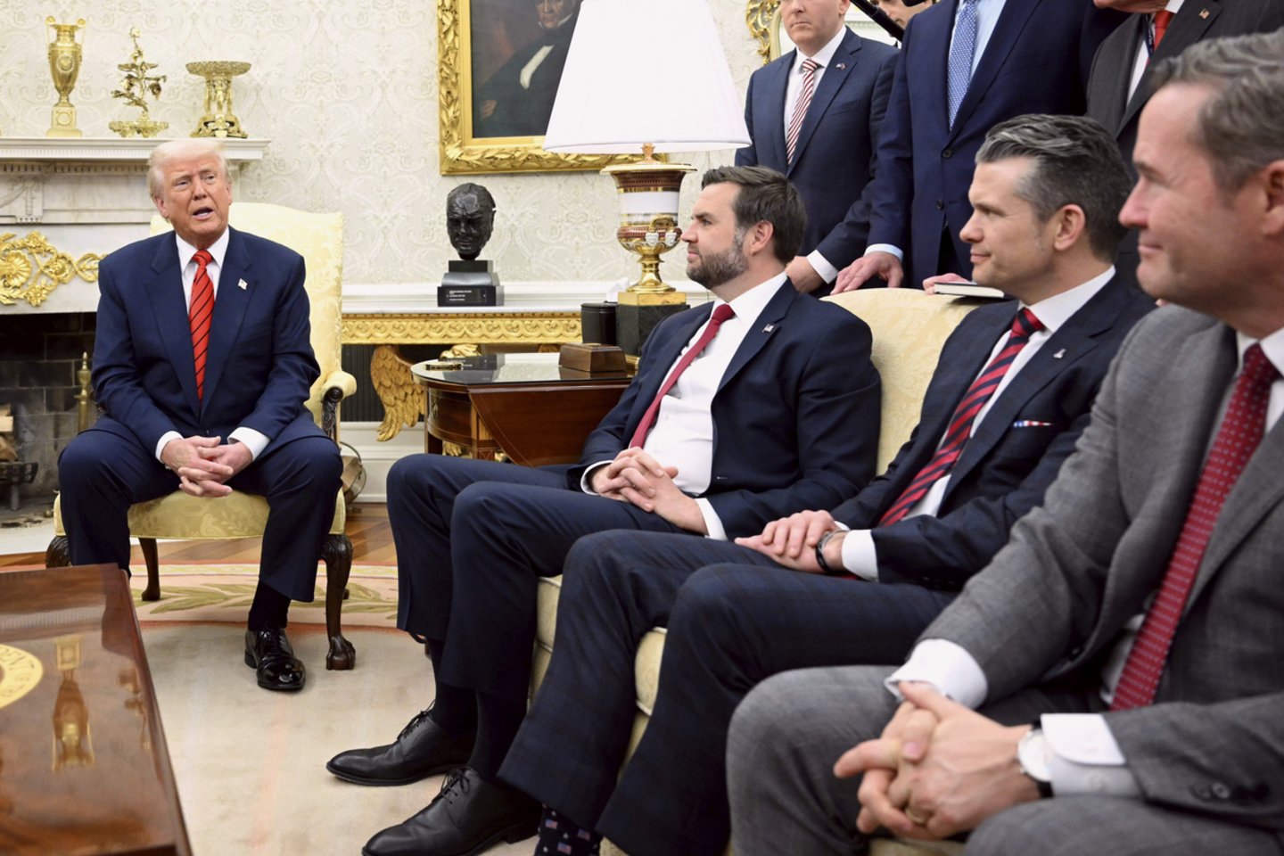 Viceprezidentas nebuvo Mar-a-Lago kurorte su D. Trumpu, kai šis vadovavo atakai. Vietoj to administracija paskelbė nuotrauką, kurioje jis veda antrinį susitikimą Baltuosiuose rūmuose, šalia jo stovi „Diet Mountain Dew“ skardinė ir niūriai atrodanti nacionalinės žvalgybos direktorė Tulsi Gabbard.
