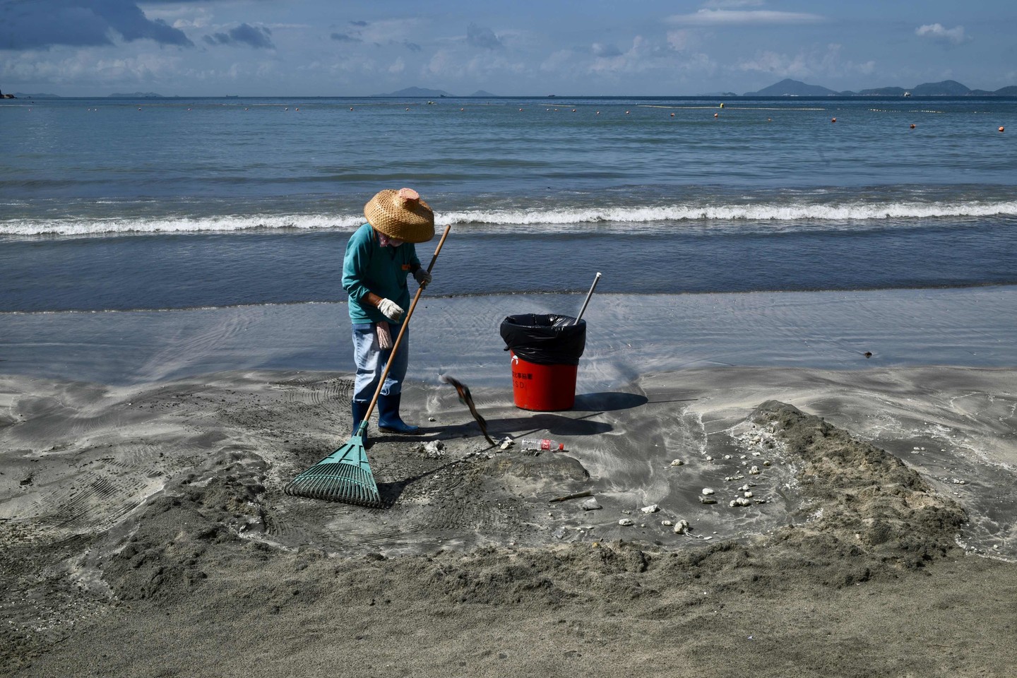 Pui O paplūdimyje, Lantau saloje, valytojai grėbstė žymųjį juodą smėlį, pirmadienį ryte, rinkdami palmių aliejaus grumstus persimaišiusius su kitomis šiukšlėmis, nuo plastikinių vandens butelių iki vaikiškų žaislų.