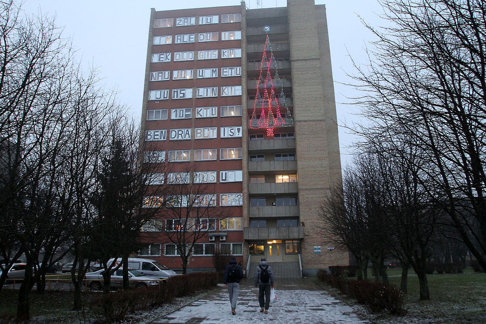Šiek tiek mažesnis sveikinimas šį KTU bendrabutį puošė ir 2012—ųjų pabaigoje, tačiau šiemet studentai ant sienos dar pakabino eglutę, pagamintą iš plastikinių butelių, kuriuos apšvietė lemputėmis.