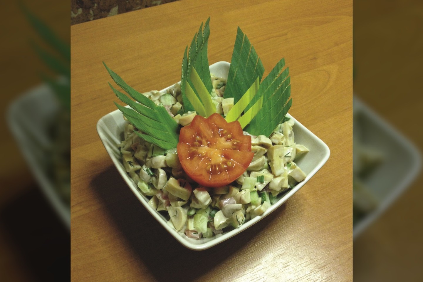 Reikės: 0,5 l marinuotų pievagrybių, 60–80 g rūkyto kumpio, 1 trumpavaisio agurko, nedidelio ryšulėlio svogūnų laiškų, žiupsnelio krapų, majonezo ir druskos pagal skonį.