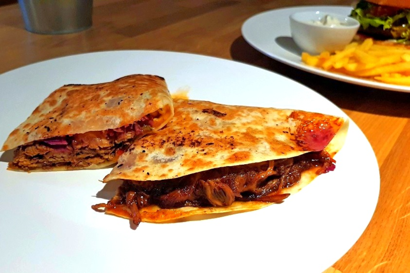 Šį kartą nusprendėme išbandyti ne tik gėrimus, tad panagrinėjome užkandžių/maisto meniu. Galimybių rinktis nebuvo daug, bet dėl to mums tik lengviau. Užsisakėme mėsainį su jautiena (8 EUR) ir kesadiliją su plėšyta kiauliena (7 EUR).