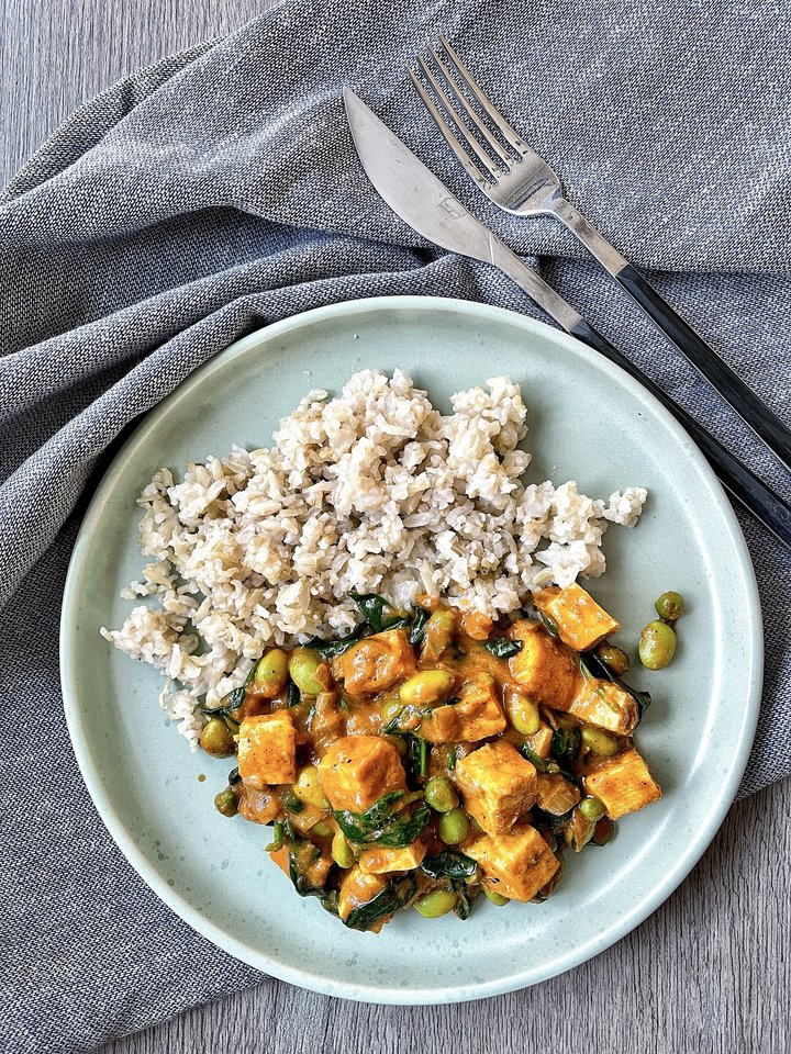 Jums reikės: apie 500 g tofu (geriausia naudoti originalaus skonio), 2 šaukštų aliejaus, 1 didesnio dydžio svogūno (smulkiai supjaustyto), 1 šaukšto su kaupu tarkuoto imbiero, 3 skiltelių česnako (smulkiai sukapoto), 1 šaukštelio kario miltelių, 1 šaukštelio maltos kalendros, ketvirčio šaukštelio kajeno prieskonių, 1 šaukštelio druskos, 400 g konservuotų pomidorų arba tyrės, 400 g (viena skardinė) kokosų „pieno“, 250 g šaldytų edamame pupelių, 150 g šaldytų žirnelių, 200 g špinatų (galite naudoti ir kitas lapines daržoves). Patiekimui naudokite virtus viso grūdo ryžius, kalendros lapelius, svogūno laiškus ir žaliąją citriną.
