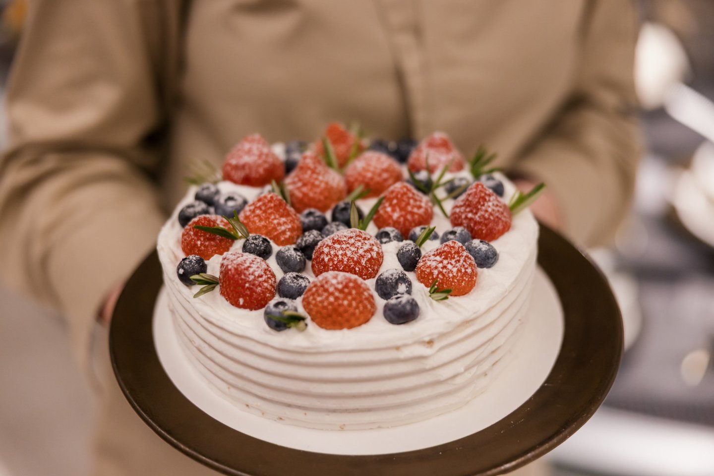 „Tortas gimsta palaipsniui: pirmiausia kepame biskvitą, kurį paliekame pastovėti apie parą. Vėliau pjaustomi biskvito lakštai ir sluoksniuojami – vienas jų sutepamas spanguolių džemu, kitas dedamas ant viršaus, o tuomet paskirstomas kremas. Naudojame maskarponės sūrį, grietinėlę, šviežias braškes, šilauoges ir spanguolių džemą. Visus biskvitus kepame patys – jie gaminami iš, cukraus, ant kraiko laikomų vištų kiaušinių ir miltų“, – pasakoja S.Gaidytė-Ašakevič.