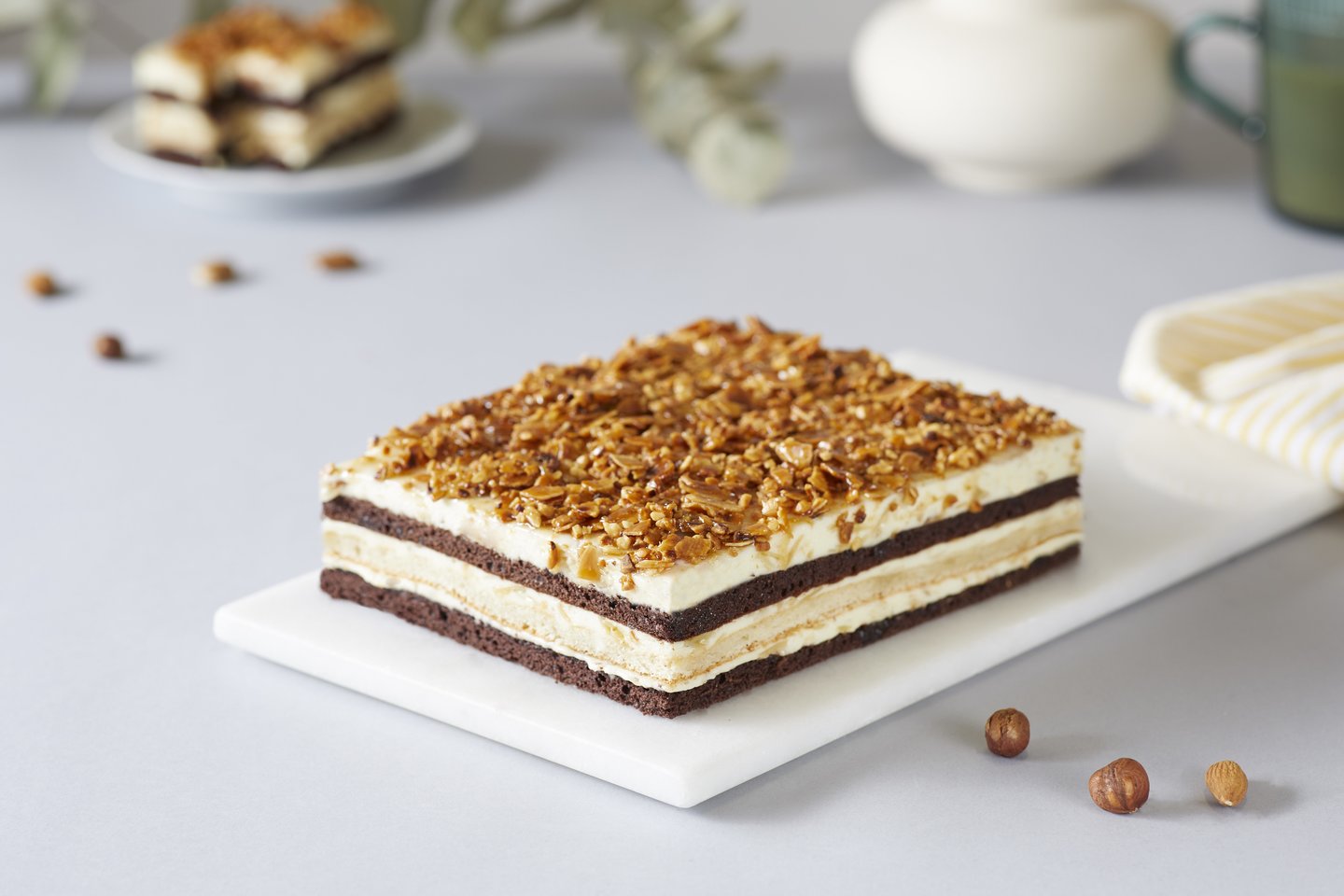 Tai dar vienas desertas, įkvėptas geriausių prancūziškų tradicijų, kurias „Iki“ diegia Th. Lauvray – čia susitinka meistrystė ir skonio elegancija. Drėgnas tamsus ir šviesus biskvitai, praturtinti lazdynų bei migdolų trupiniais, išsiskiria maloniu sluoksnių kontrastu. Trapus riešutinis sluoksnis suteikia subtilaus traškumo, o švelnus kremas subalansuoja saldumą. Visa tekstūra išlieka drėgna ir sodri, o skoniai gilūs, šiek tiek nostalgiški. Tai desertas su charakteriu, pakankamai saldus, kad pamirštum saiką, bet toks viliojantis, kad norėtum dar gabalėlio.