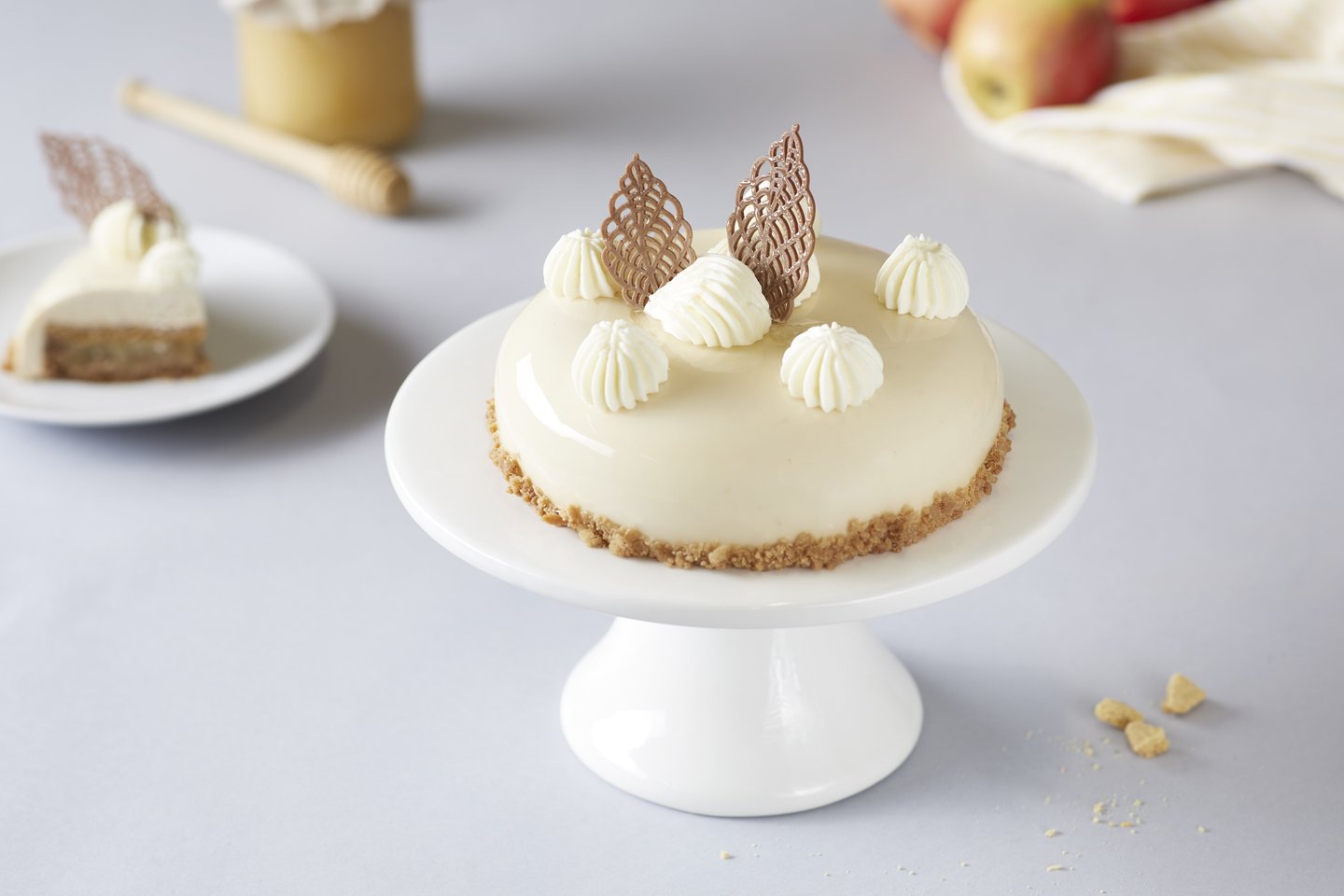 „Iki“ konditerio teigimu, šis pyragas, kvepiantis medumi ir sunokusiais obuoliais, alsuoja rudens jaukumu. Traškūs karamelinių sausainių trupiniai dera su švelniu medaus biskvitu, o obuolių kubelių įdaras suteikia gaivos ir natūralaus saldumo. Grietinėlės kremas prideda švelnumo, o sirupas, drėkinantis biskvitą, išryškina visų sluoksnių darną. Tai sodraus, bet neapsunkinančio skonio pyragas, dvelkiantis prieskoniais ir šiluma – toks, kurį norisi ragauti lėtai, prie kavos, mėgaujantis ypatinga akimirka kasdienybėje.