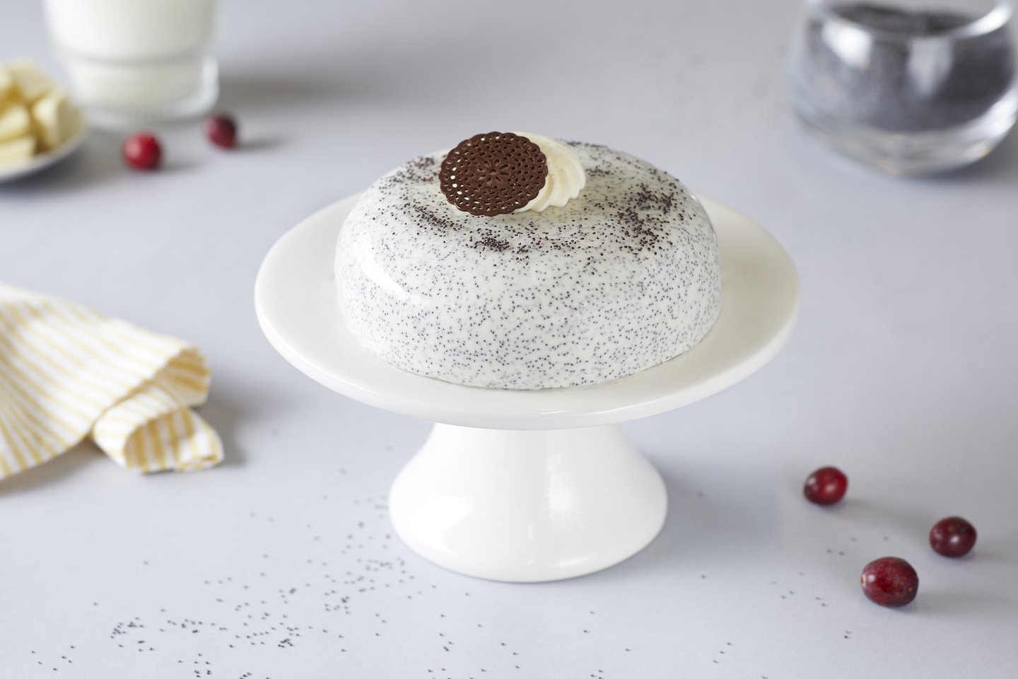 Desertas, kuriame gaiva susitinka su elegancija, tortą pristato „Iki“ konditeris. Baltas biskvitas ir aguonų grūdeliai sukuria švelnią, žaismingą tekstūrą, o spanguolių rūgštelė įneša gyvybės ir gaivos. Lengvas grietinėlės kremas viską apjungia į subtilią visumą, kurią vainikuoja šokoladinis akcentas, tarsi mažas prancūziškas kaprizas, suteikiantis desertui išbaigtumo. Tai tortas, dvelkiantis lengvumu ir šventišku džiaugsmu, lyg saulėtas sekmadienis.
