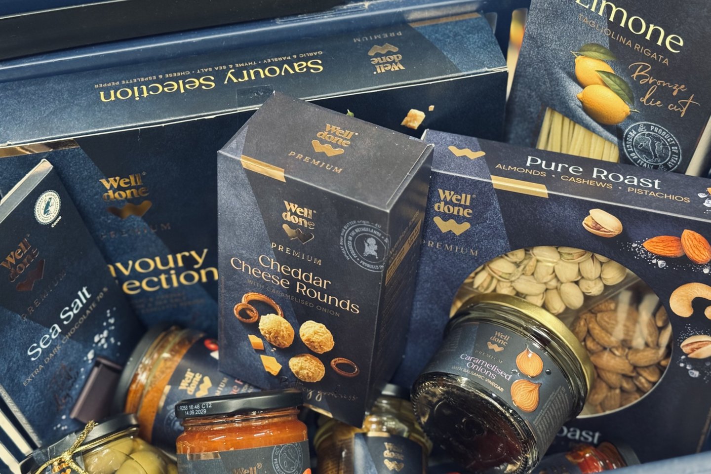 Ji dalinasi idėjomis, kokius nebrangius, bet džiuginančius valgomų dovanų rinkinius galima sukomplektuoti iš „Well Done Premium“ kokybiškų produktų, kurie yra kruopščiai atrinkti ir atkeliavę iš patikimų Lietuvos, kaimyninių ar kitų Europos šalių gamintojų.