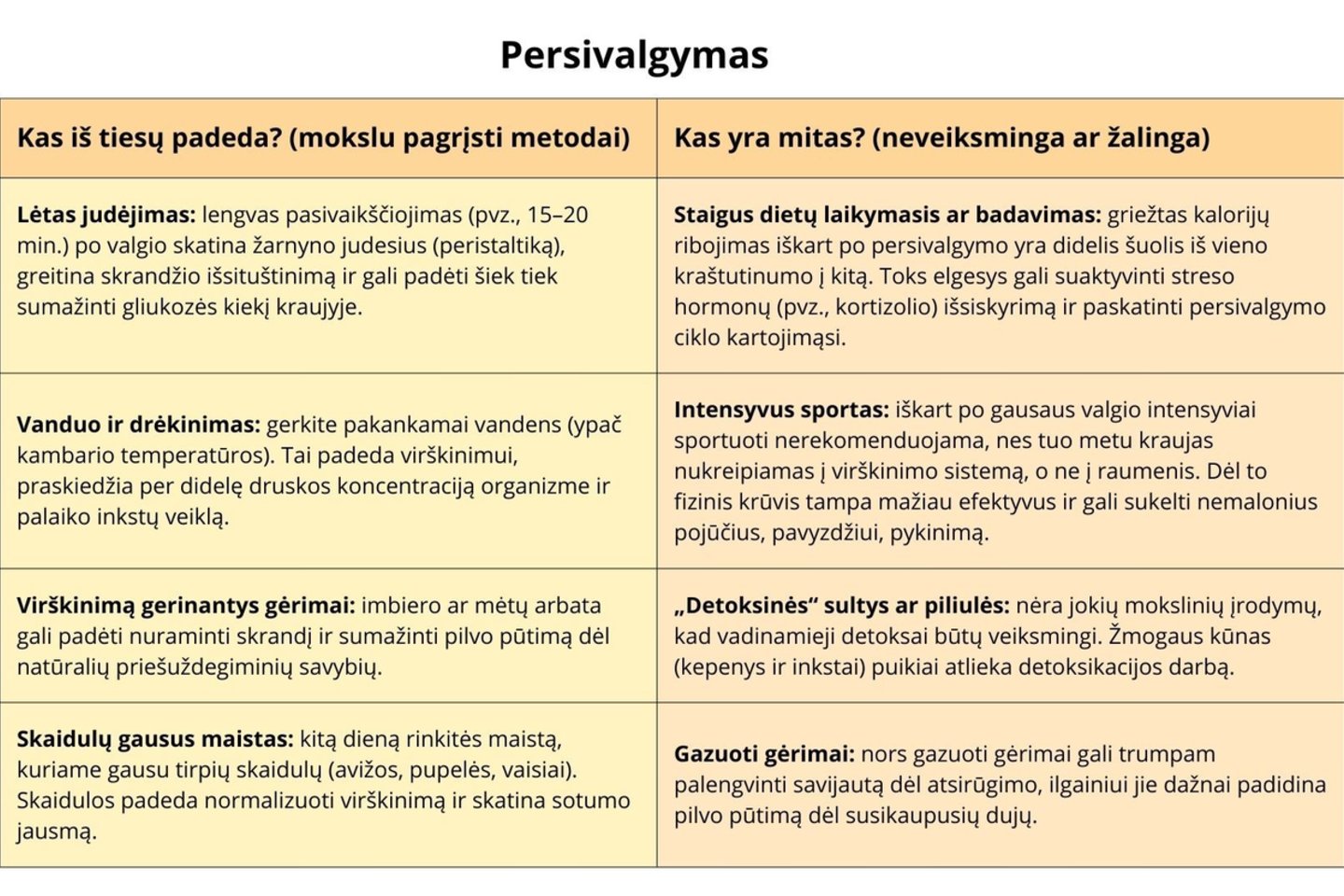 „Ankstyvesnė vakarienė (apie 17 val.) suteikia organizmui daugiau laiko suvirškinti didesnį maisto kiekį iki miego, todėl gali sumažinti naktinių virškinimo sutrikimų ir riebalų kaupimosi riziką. Tuo tarpu vėlyva vakarienė (apie 20 val. ar vėliau) dėl sulėtėjusio virškinimo ir sumažėjusio metabolinio efektyvumo gali sustiprinti persivalgymo padarinius. Be to, jei valgoma vėlai po ilgo badavimo, pavyzdžiui, praleidus pietus, tikimybė suvalgyti daugiau padidėja, nes organizmas būna labai išalkęs“, – sako ji.