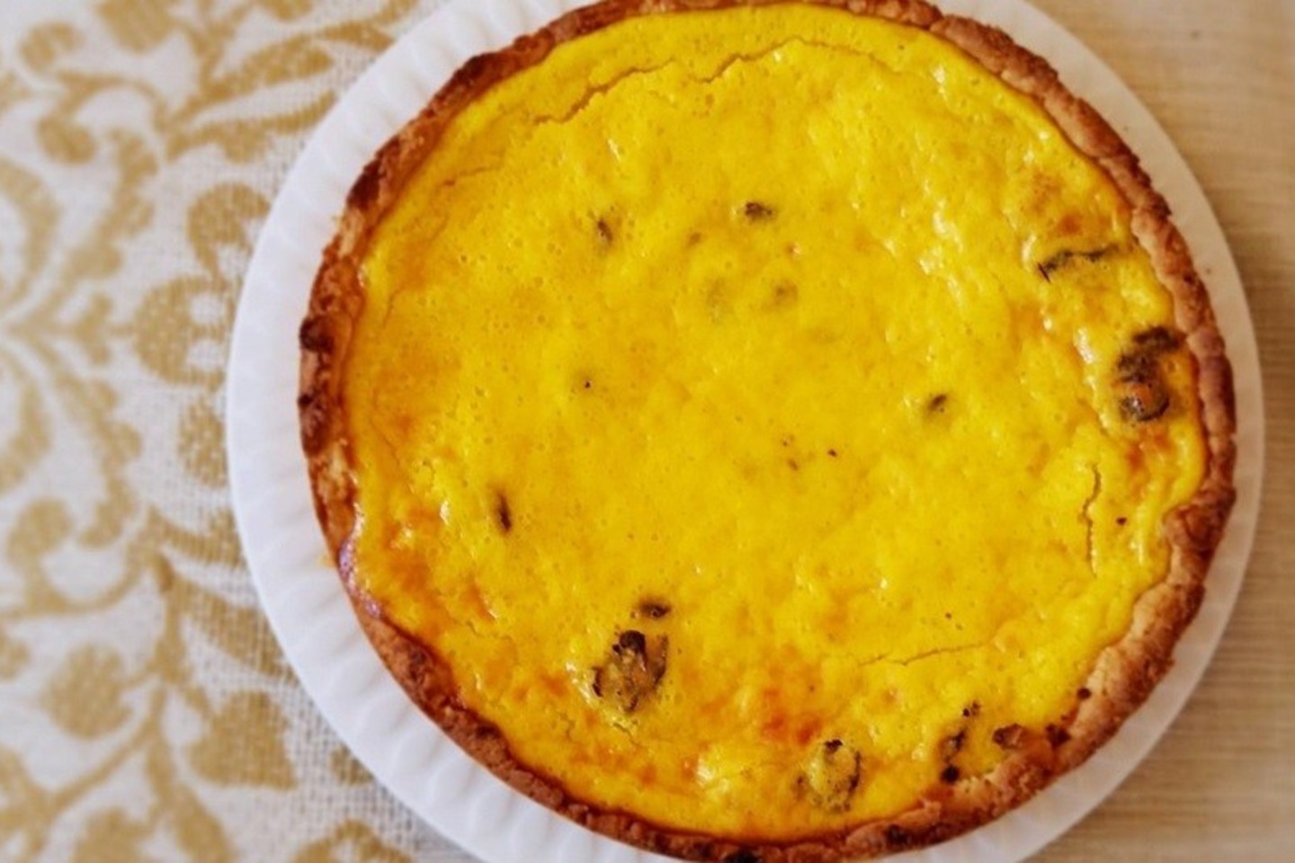 Jorkšyro varškės pyragas su rožių vandeniu ir razinomis