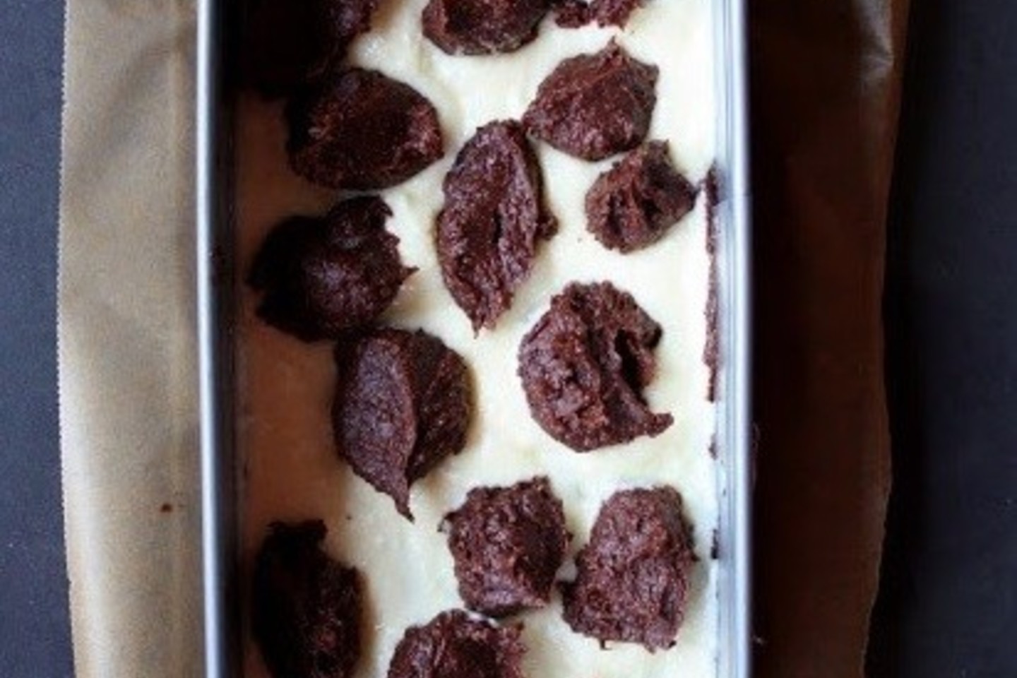 Daugiau nei pusę paskleisti jos į kepimo formą, ant jos šaukštais dėti varškės masę, ir tada – likusią šokoladinę masę.