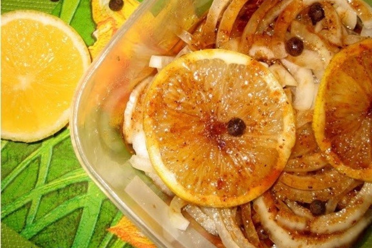 Silkę supjaustome gabaliukais, dedame į indelį, ant viršaus pusžiedžiais pjaustytą svogūną ir citrinos griežinėlius.