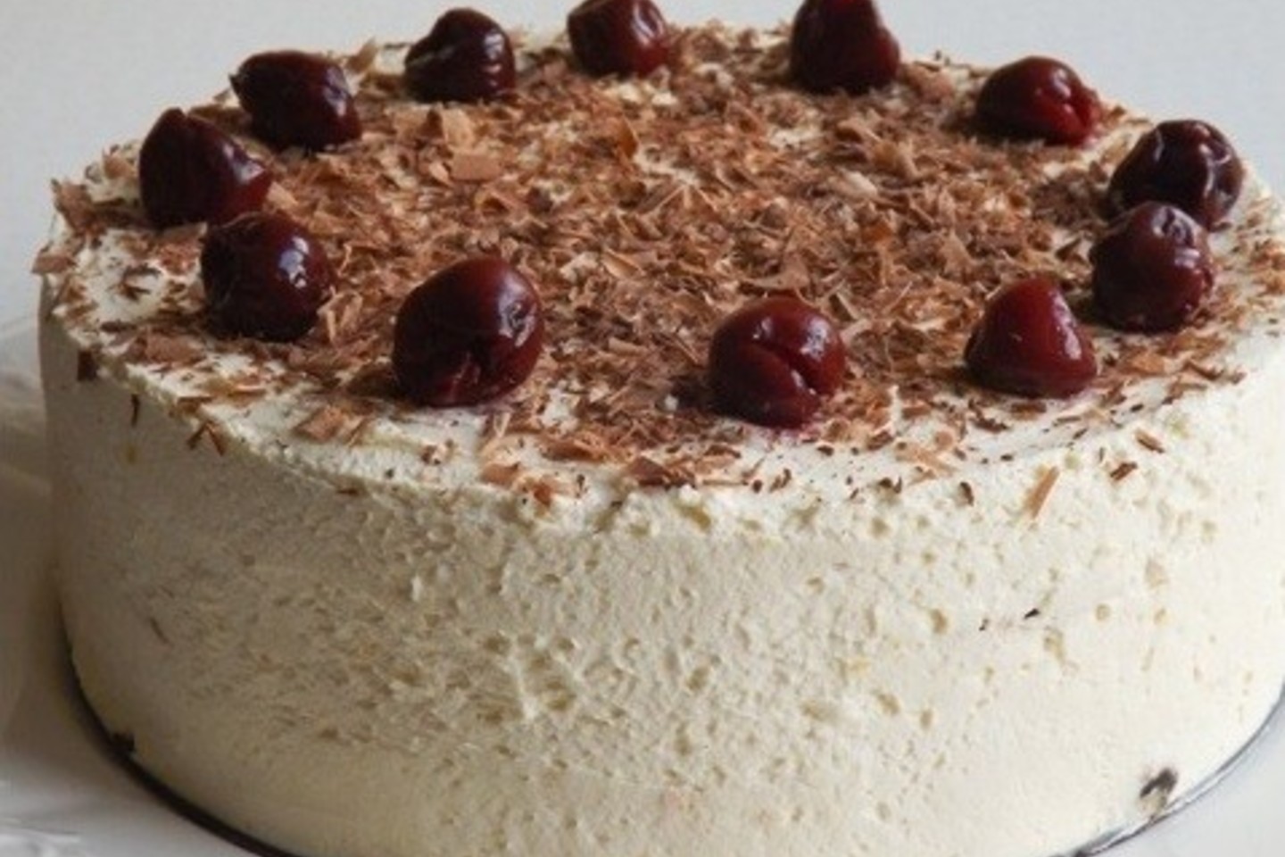 Išimkite iš formos, puoškite tarkuotu šokoladu ir vyšniomis.