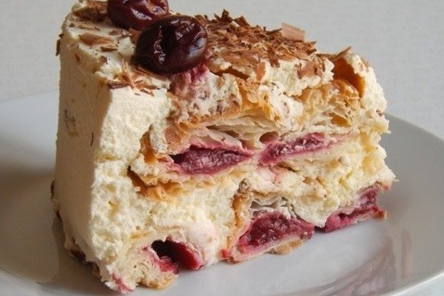 Patarimai, pastebėjimai. Pagal orginalų receptą reiktų dviejų sluoksniuotos tešlos pakelių šiek tiek didesniam tortui (23 cm skersmens). Tešlos taip pat nereiktų kočioti, tiesiog supjaustyti į 8 cm pločio juostas ir po tris juostas dėti į kiekvieną kepimo formą. Tokiu atveju reiktų ir žymiai daugiau kremo. Jei kepsite didesnėje formoje, imkite daugiau tešlos.