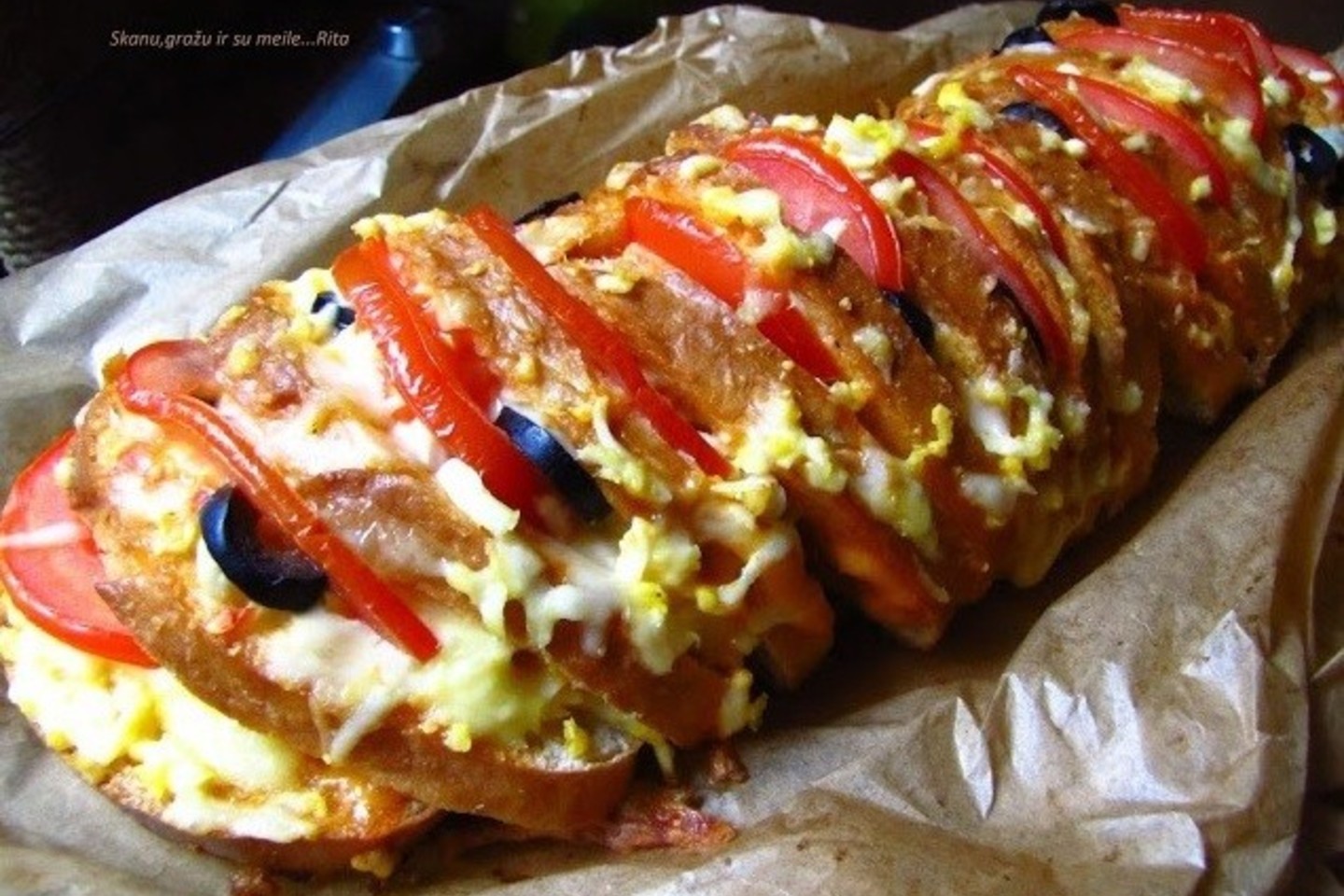 Padažu aptepame visas vienos pusės riekeles, tik padažo reikėtų minimaliai, kitaip batonas labai suminkštės. Barstome fermentinio sūrio ir kiaušinių masę, dedame smulkintas alyvuoges, riekelėmis pjaustytą „Brie“ sūrį, pomidorus.