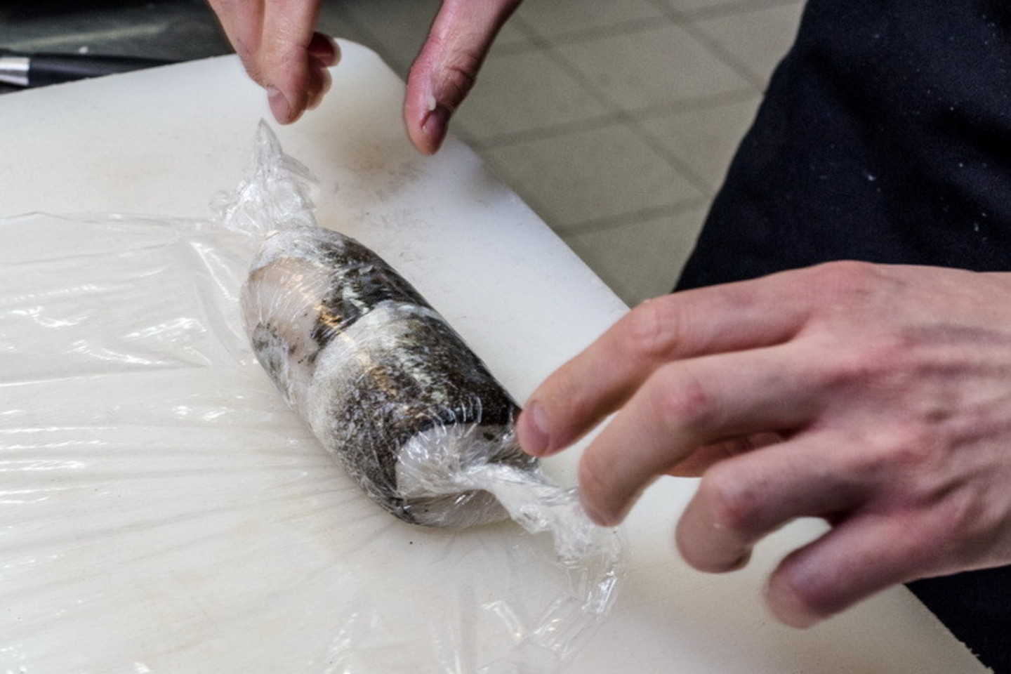 Ant stalo patieskite didelį gabalą maistinės plėvelės. Paklokite menkės odą, suglauskite abu gabalėlius. Ant odos skersai dėkite filė ir tampriai susukite. Plėvelę apvyniokite daug kartų, kad verdant neišbėgtų sultys. Galus užsukite ir užriškite virvele.