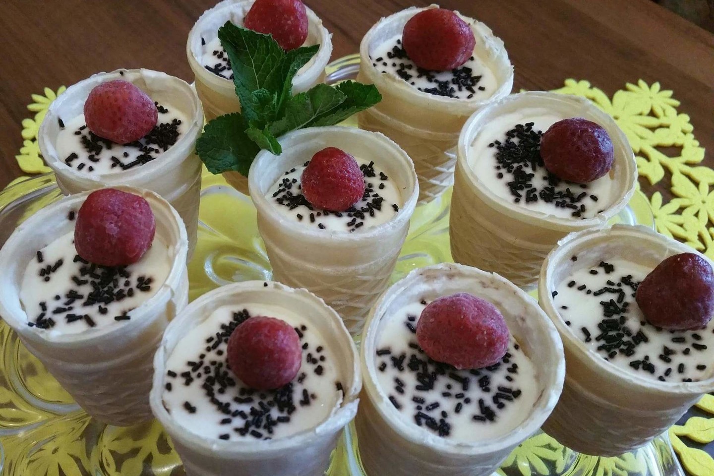 Kondensuotą pieną ir grietinėlę gerai suplakiau, supyliau į vaflines stiklinaites ir palikau šaldiklyje stingti (stiklinaites pirkau prekybos centre).